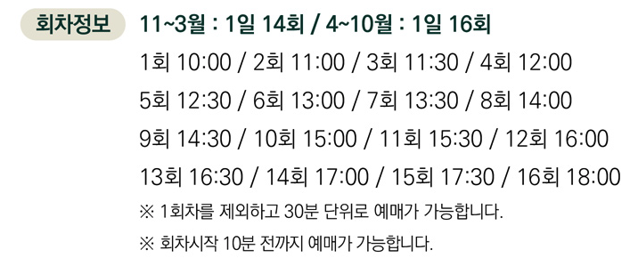 예매는 1회 차부터 18회 차까지 30분 간격으로 선택할 수 있습니다.