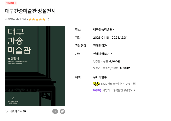 대구 간송미술관 예매는 '인터파크 티켓'을 통해 운영되고 있습니다.