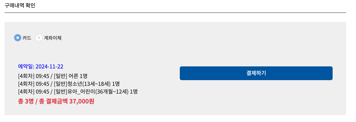 마지막으로 예약 날짜와 시간, 이용 인원수와 가격을 확인하신 후 신용카드 또는 계좌이체 중 원하시는 결제 방법을 선택하시고 '결제하기' 버튼을 눌러주세요.